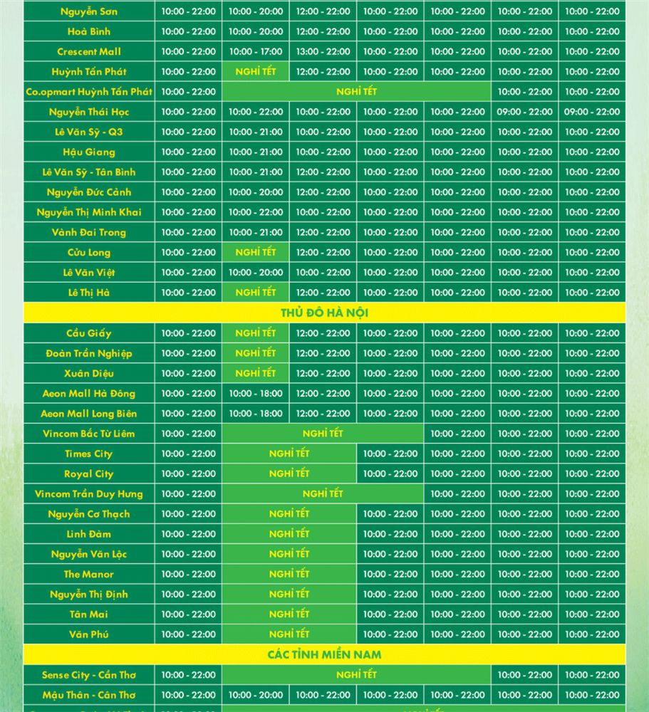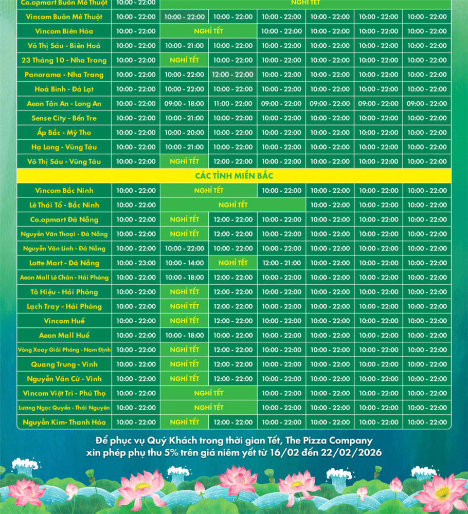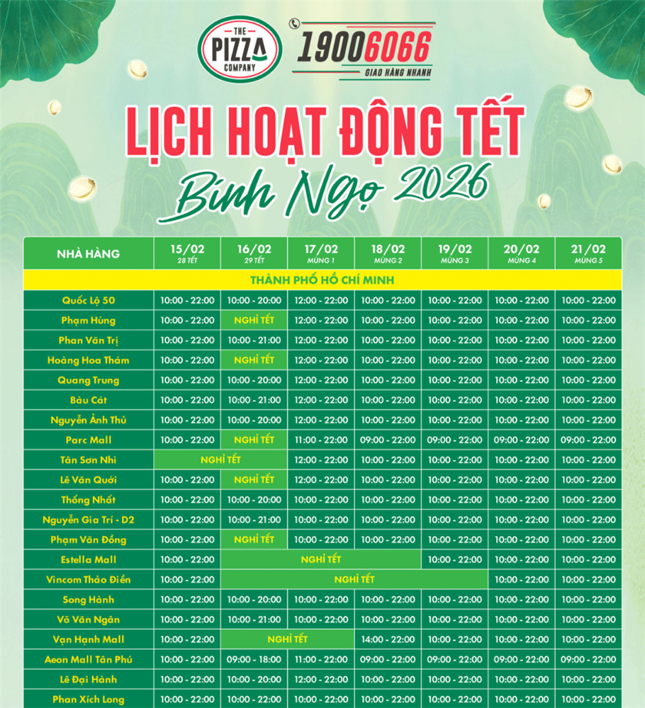 Để phục vụ tốt hơn trong dịp Tết Nguyên Đán Bính Ngọ 2026 và bảo đảm cho các quý khách hàng có thể thuận tiện ghé qua nhà hàng, The Pizza Company xin thông báo lịch hoạt động Tết chi tiết của từng nhà hàng bên dưới.